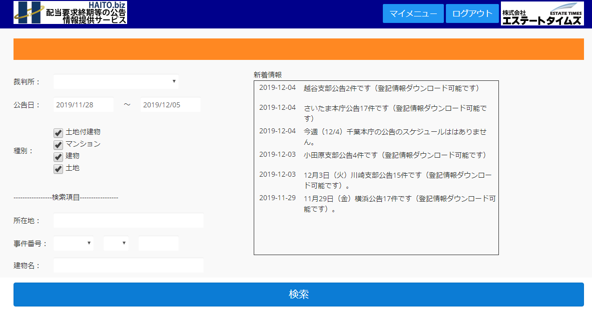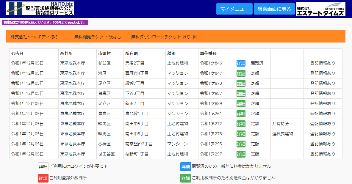 配当要求終期等の公告に付された物件の一覧(所在地、事件番号、公告日等が表示されます)。基本的に毎日物件が追加されます(閉庁日を除く)。