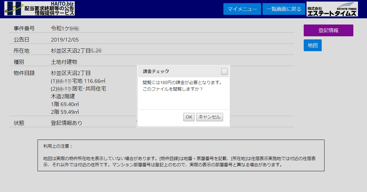 物件の地番、家屋番号、地積、構造、面積、マンション名その他が表示されます。地図ボタンを押すと地図にリンク、登記情報ボタンを押すと登記情報(全部事項)をダウンロードすることができます(クリック後に確認画面が表示されます)。
