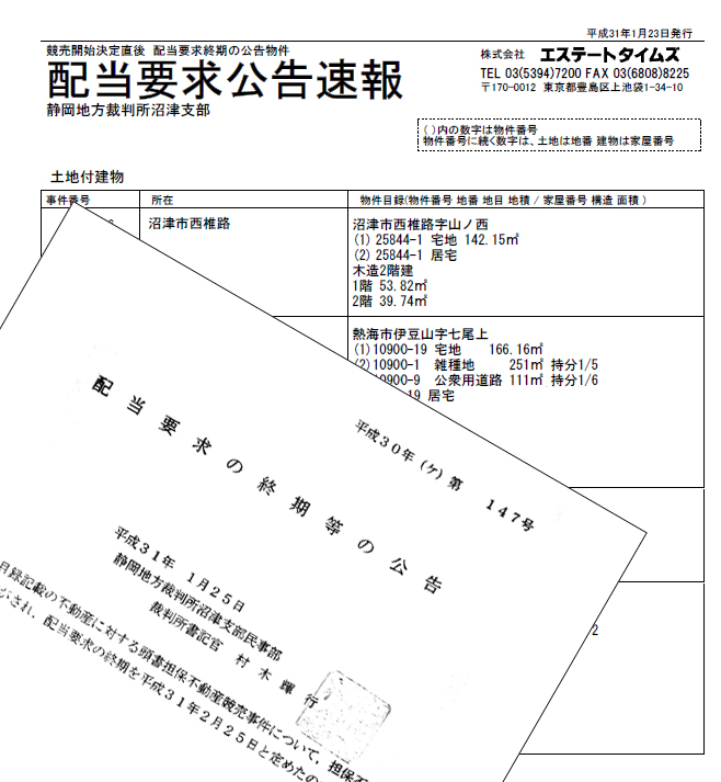 競売申立後、差押え・競売開始決定直後の不動産です。近日中に任意での売却が行われる可能性が高い物件です。当サービスでは裁判所の公告を一覧表のメール・FAXで配信するとともにWEBサイトHAITOI.bizで閲覧できます。配当要求終期の公告とは、競売開始となった物件について債権者が配当等を受けるために、他債権者が申し立てた競売手続に参加する手続きの終期を裁判所が広く知らせるものです。